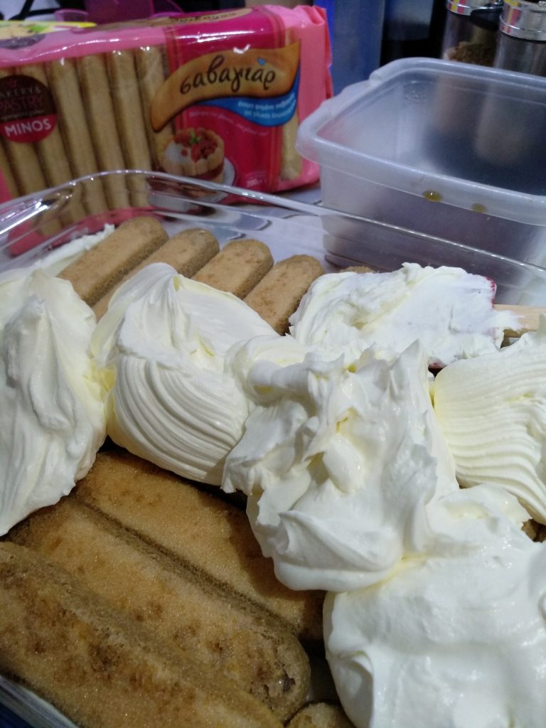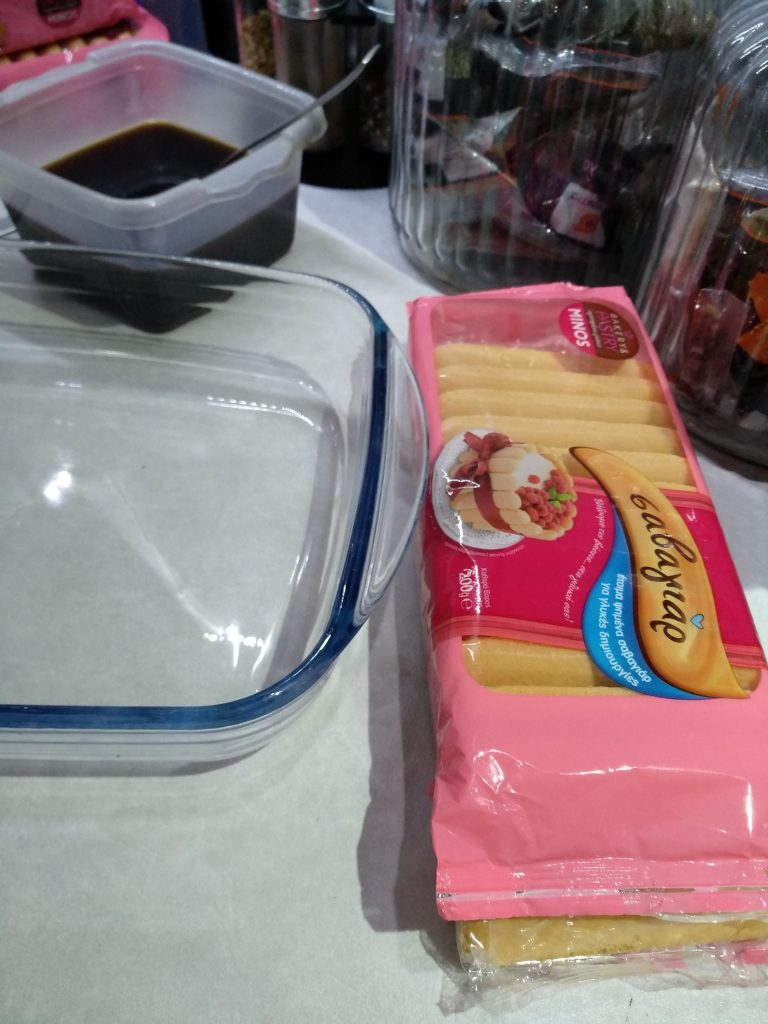 Θα χρειαστούμε ένα ταψάκι περίπου 36*25 και αρχίζουμε να βουτάμε τα σαβουαγιάρ ένα ένα μέσα στο καφέ. (Επειδή τα σαβουαγιάρ έχουν την τάση να απορροφούν πολύ γρήγορα τα υγρά στοιχεία, θα τα βουτήξετε για δευτερόλεπτα.) Θα κάνετε μια στρώση με τα σαβουαγιάρ και από πάνω θα βάλετε την μισή κρέμα και θα επαναλάβετε ακόμα μια φορά την διαδικασία.