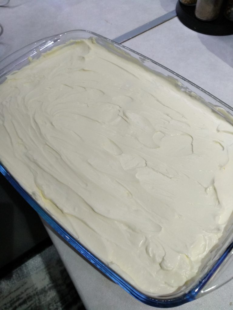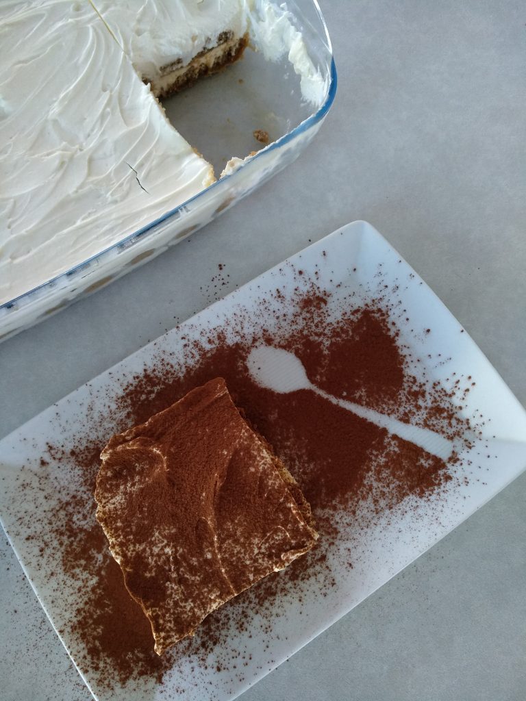 Αφήνουμε το ταψί στο ψυγείο για 4 ώρες να σταθεροποιηθεί το γλυκό μας. Όταν θα το σερβίρεται το πασπαλίζεται με κακάο σκόνη.