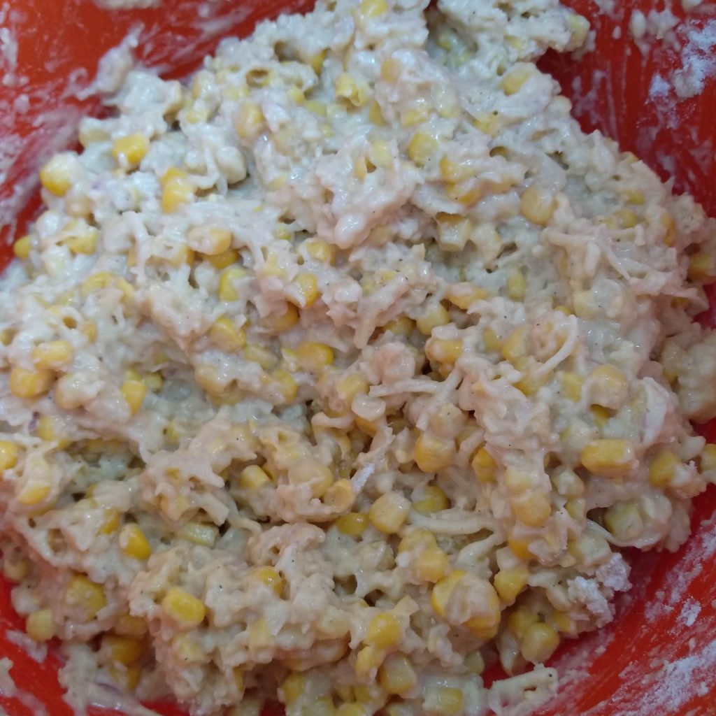 Η διαδικασία είναι απλή και πανεύκολη. Αφού έχετε στραγγίξει καλά το καλαμπόκι το βάζετε σε μια λεκάνη και συμπληρώνετε και τα υπόλοιπα υλικά.