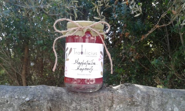 Σπιτική Μαρμελάδα Καρπούζι 500 gr. Ενώ το καρπούζι γλυκό είναι συνηθισμένο σε πολλές περιοχές, η μαρμελάδα καρπούζι δεν συγκαταλέγεται ανάμεσα στις κλασικές μαρμελάδες.Ντελικάτη, ροδοκόκκινη, απόλυτα καλοκαιρινή η μαρμελάδα καρπούζι!Είναι δροσερή, γλυκιά και το προτέρημα της μαρμελάδας καρπούζι είναι ότι εκτος από το πρωινό μπορεί να χρησιμοποιηθεί και πάνω σε λευκό τυρι… και πιστέψτε με ότι η απόλαυση είναι μοναδική!Το καλοκαίρι το καρπούζι εχει την τιμητική του. Δροσερό φρουτακι χωρίς θερμίδες χορταστικό με υπέροχο άρωμα! Αυτη η μαρμελάδ μπορεί να γίνει με 2 τρόπους: είτε με τη σάρκα είτε με το άσπρο μέρος (οπως το γλυκό κουταλιού) εμείς σας την προσφέρουμε την υπέροχη μαρμελάδα καρπούζι μόνο με την σάρκα!